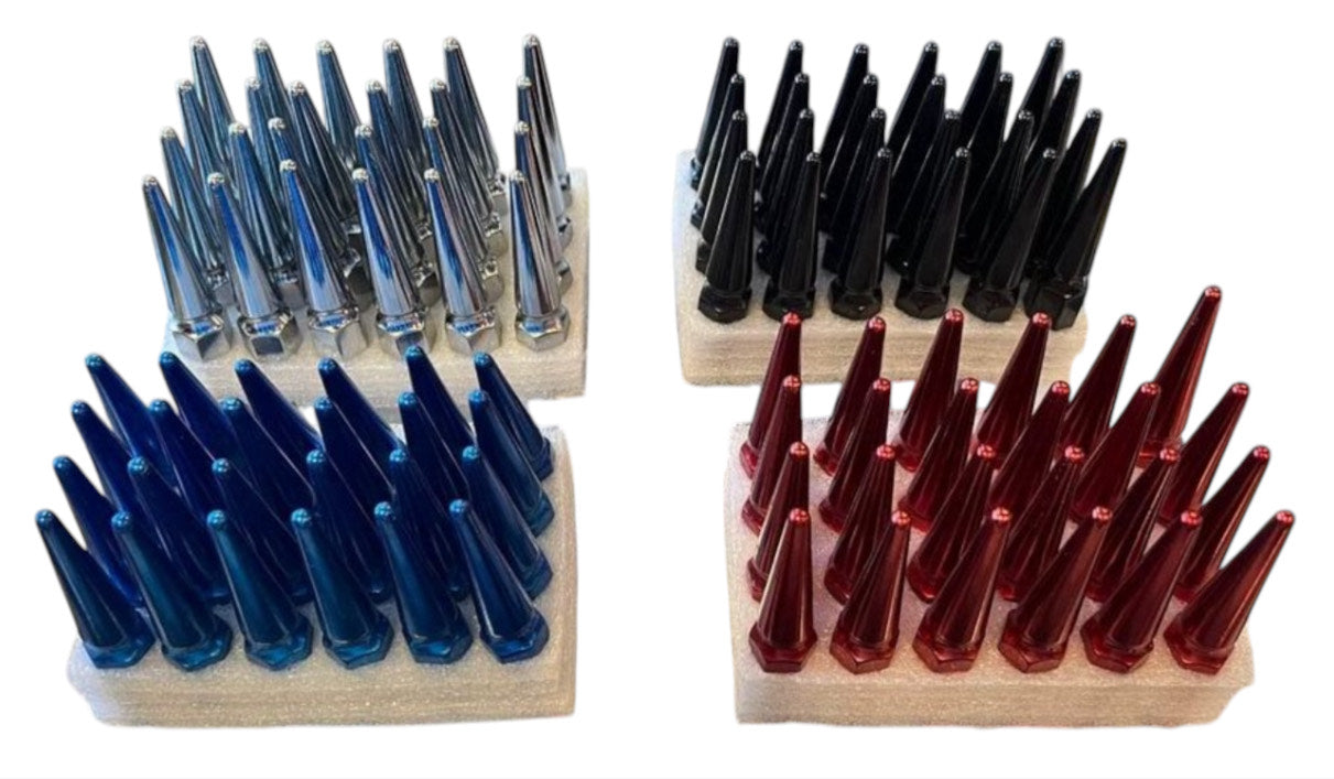 Spike Lug Nuts. Available in Chrome, Red, Blue and Black finishes. 1/2-20. 14x1.5, 14x2, 12x1.5, 12x1.25, 9/16-18, 7/16-20 thread sizes.